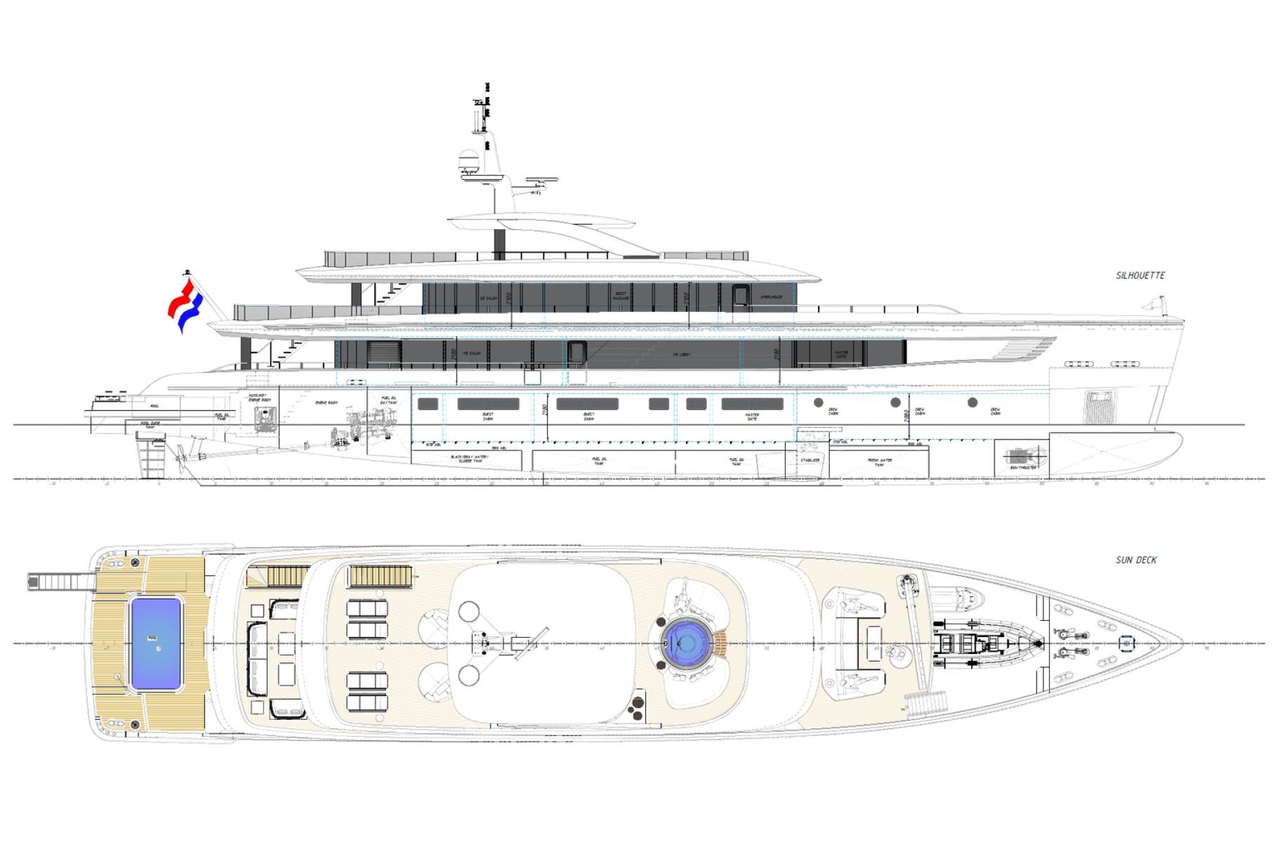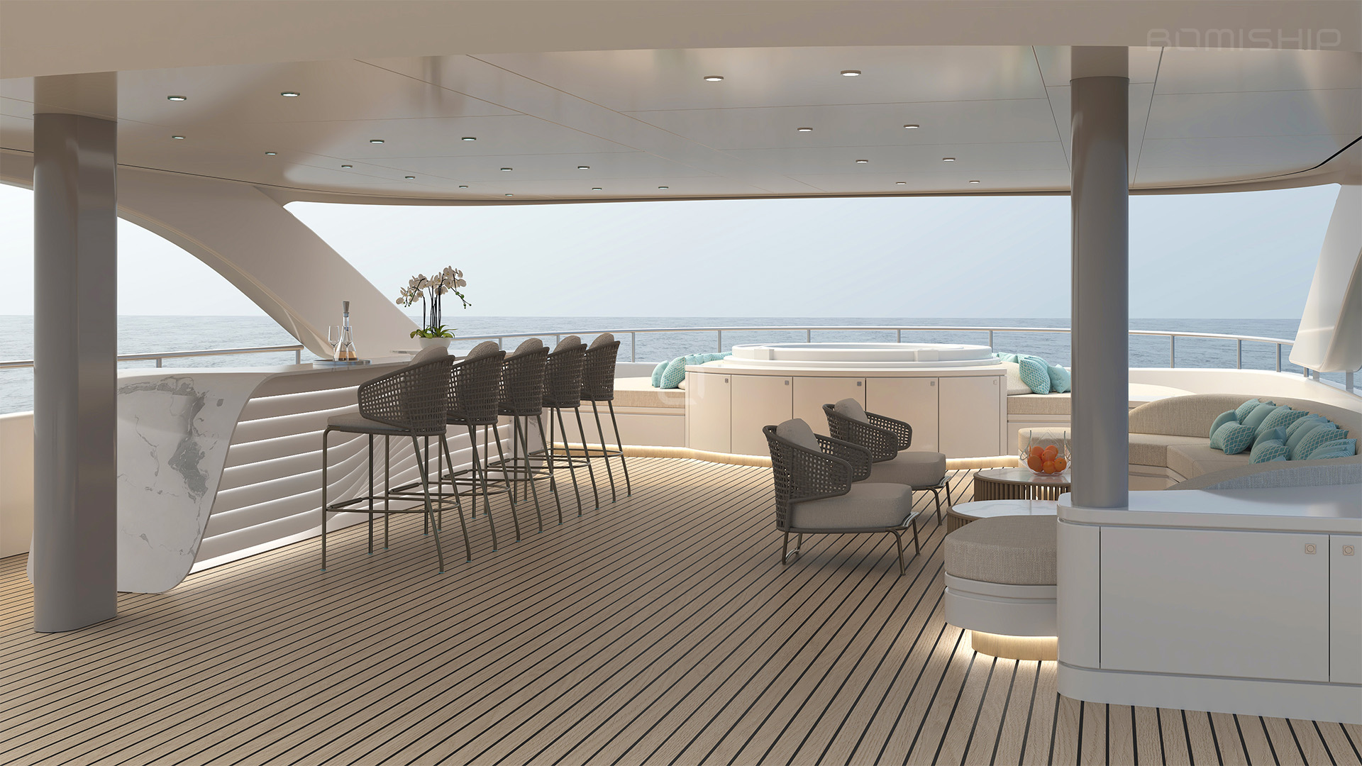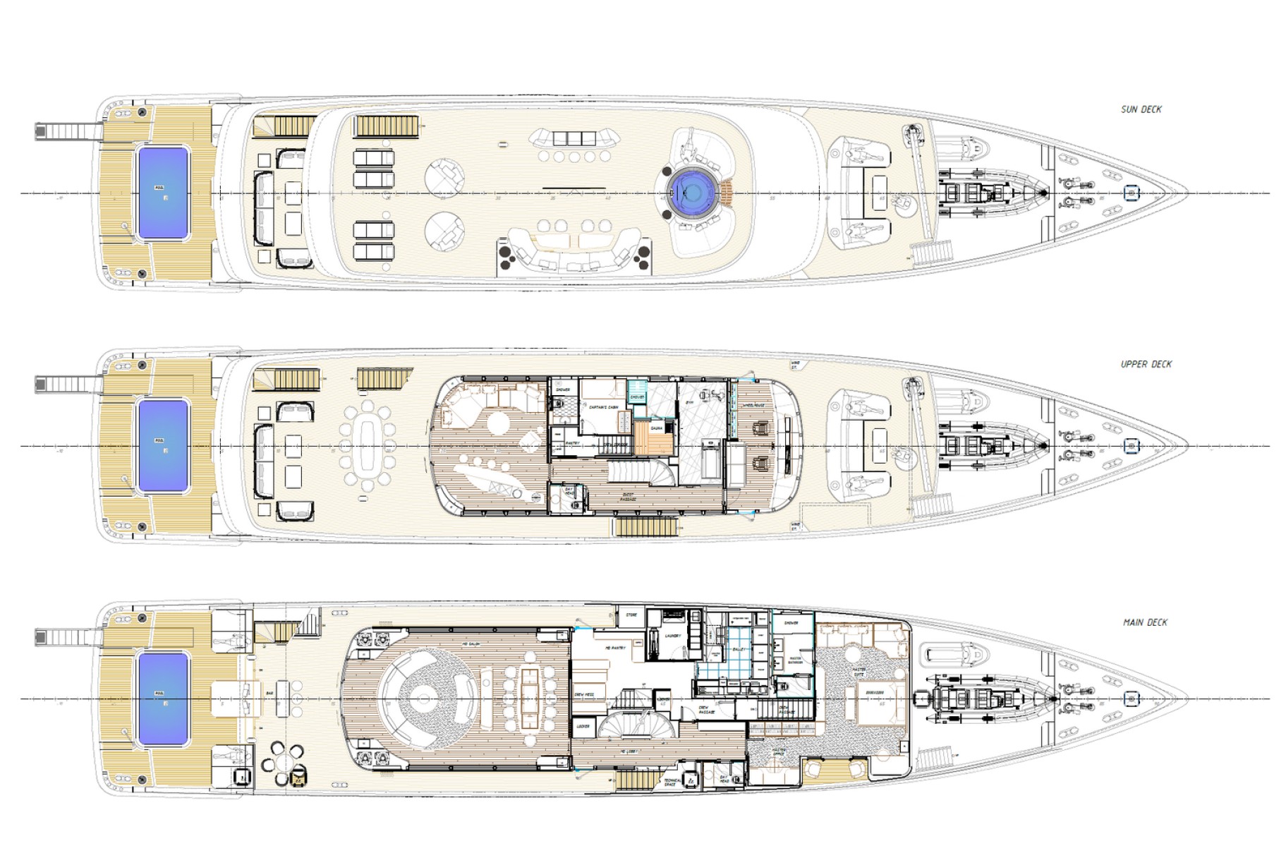 The main deck features a spacious lounge with a bar leading to a large swimming platform with a pool and beach club, creating the perfect setting for relaxation by the sea. On the upper deck, guests can enjoy al fresco dining at a round table for 12, unwind on sunbeds, or gather in the lounge. The sun deck is designed for leisure with a jacuzzi, BBQ facilities, and expansive sunbathing areas.