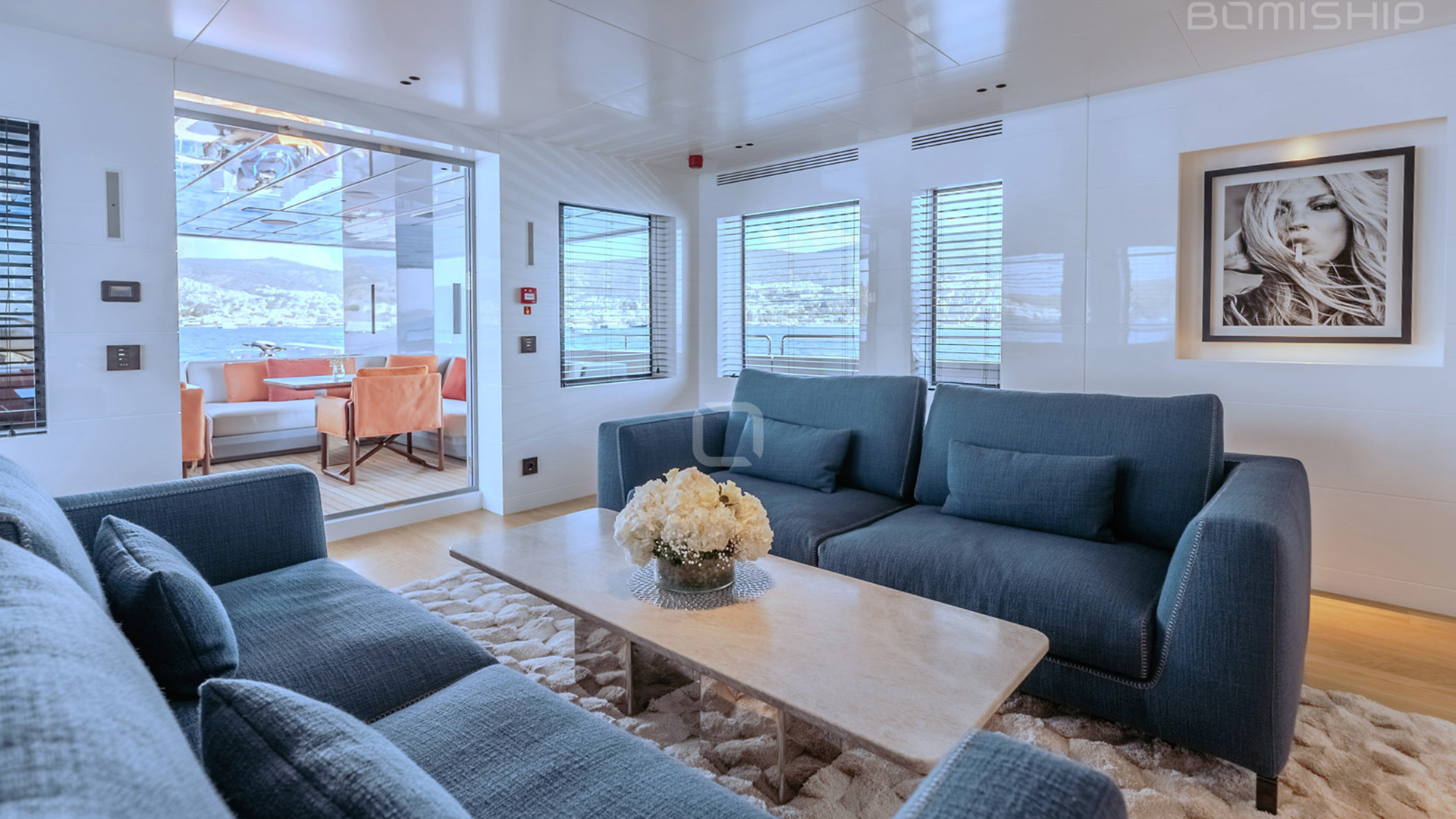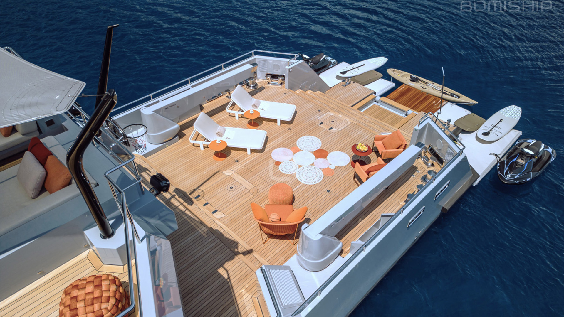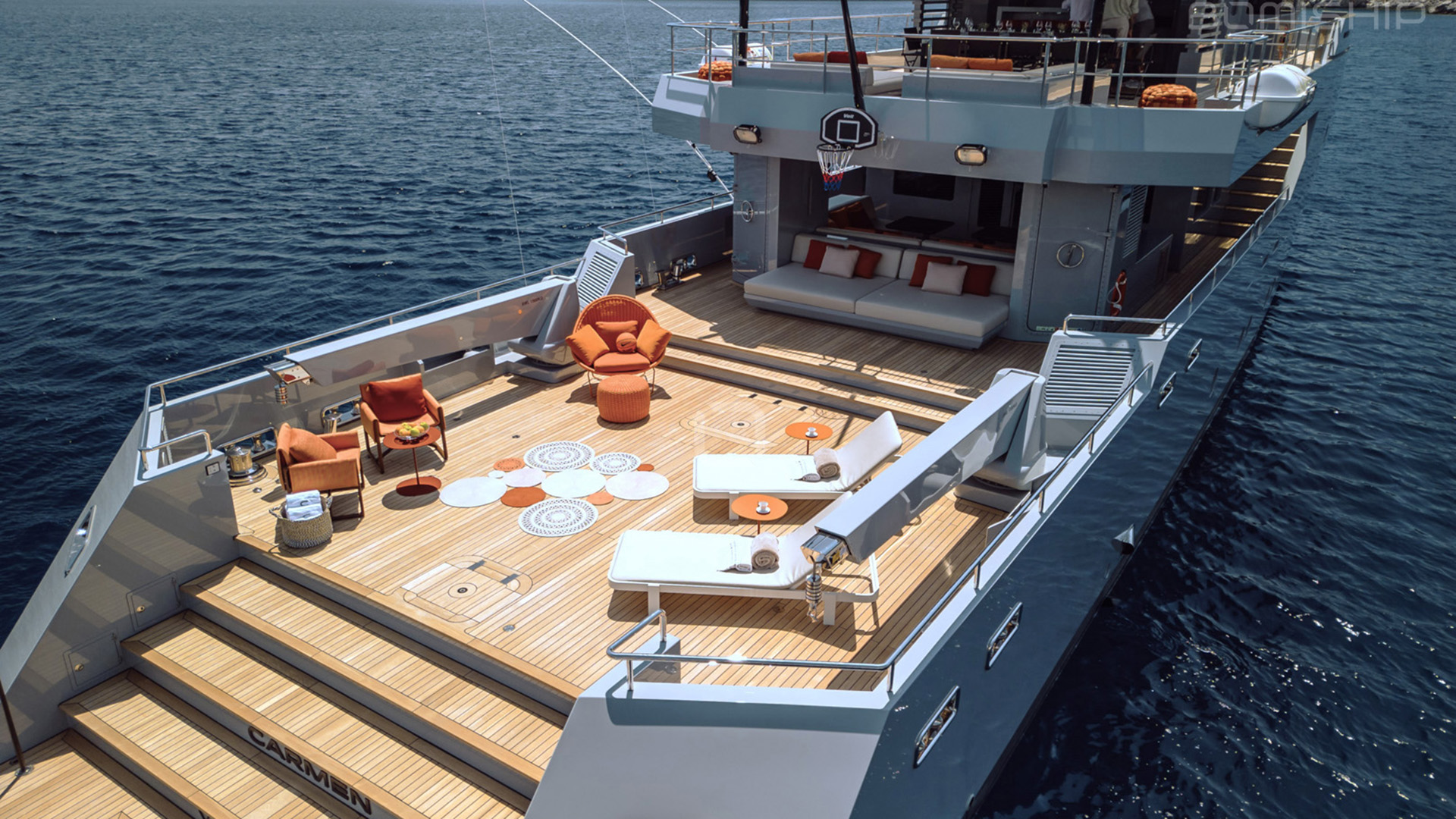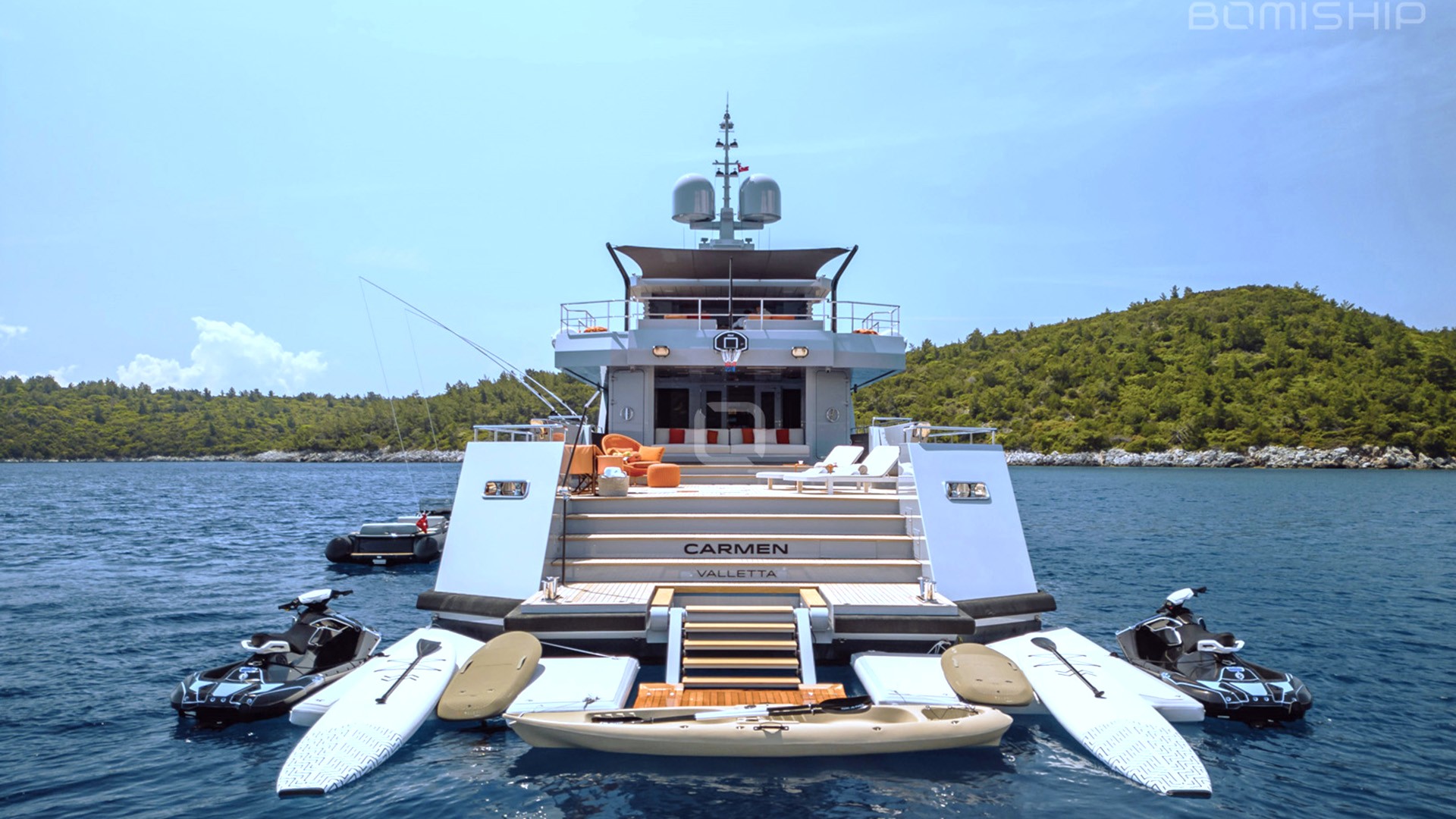 Launched with a bold explorer-style silhouette and conceived for high-energy charter experiences, Carmen is more than just a yacht; she’s a playground of action, elegance, and expansive freedom on the sea. With her strong lines, angular exterior, and beach house-inspired interior, Carmen masterfully bridges the worlds of luxurious leisure and adventure-driven living. Designed to accommodate up to ten guests, Carmen offers five spacious cabins, tailored for a variety of charter groups, including families, couples, and friends seeking shared thrills. The standout feature is the full-beam Master Suite, located on the main deck, complete with a king-size bed, bespoke designer touches, and an ensuite bathroom boasting twin sinks and a rain shower. The lower deck features two double and two twin cabins, all en-suite, ensuring equal comfort across the board. Life onboard Carmen is centered around vibrant social zones and laid-back luxury. The sky lounge serves as the heart of entertainment with a dining table for ten, an American-style bar, a built-in grill, and oversized sun pads. From alfresco dinners on the shaded aft deck to intimate meals in the main salon, every setting has been created with flexibility and enjoyment in mind. A premium wine cellar, walk-in fridges, and high-end appliances ensure top-tier dining experiences. At the same time, custom Bromic outdoor heaters allow guests to enjoy the open decks in complete comfort, regardless of the weather. Adventure pulses through every inch of Carmen’s outdoor space. The expansive aft deck opens into a dynamic beach club perfect for sunbathing, socializing, or setting off on a day of watersports. With a transformer platform built into the stern, boarding tenders, diving into the sea, or launching a jet ski is effortlessly elegant. At the bow, the hidden pool/jacuzzi, clad in Bisazza tiles, offers both functionality and minimalist design easily concealed under a teak deck when not in use, thereby expanding the outdoor lounging space. Dining, exploration, and relaxation blend seamlessly with service delivered by a seasoned and energetic seven-person crew. Each member brings expertise and dedication to ensure your days at sea are filled with unforgettable moments, whether it’s a sunrise yoga session, a day packed with toys and tenders, or a candlelit dinner under the stars. Carmen sets a new standard for boutique adventure on the water. She’s not just a yacht, she’s a call to action, a retreat, and a luxurious experience that invites you to dive in, lean back, and let the sea set your rhythm.