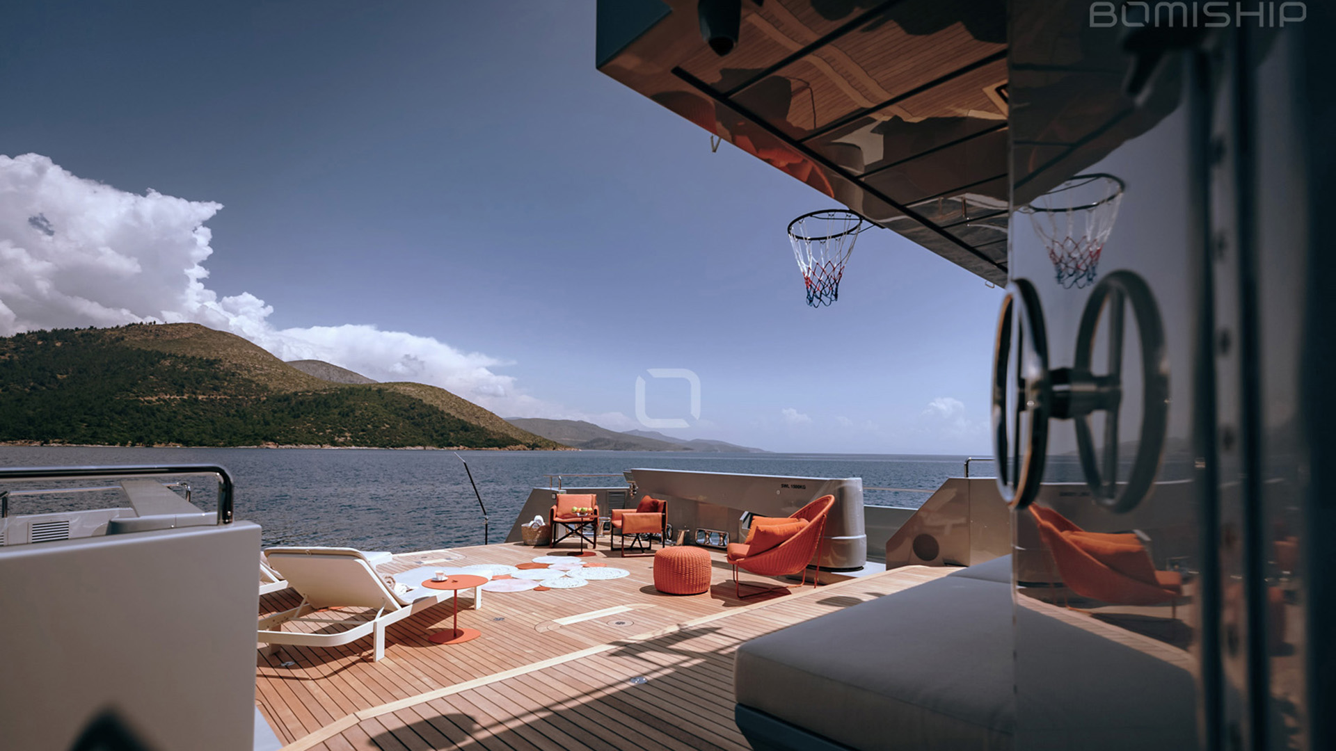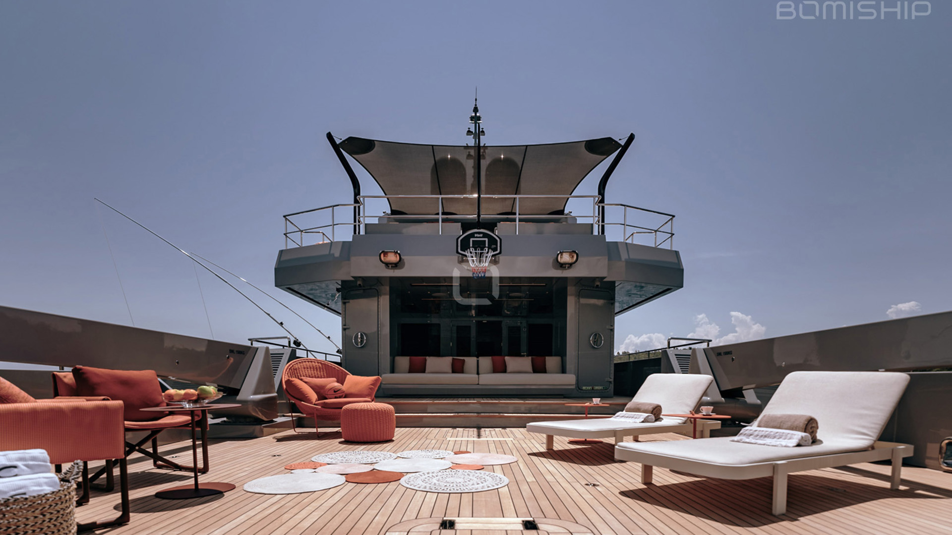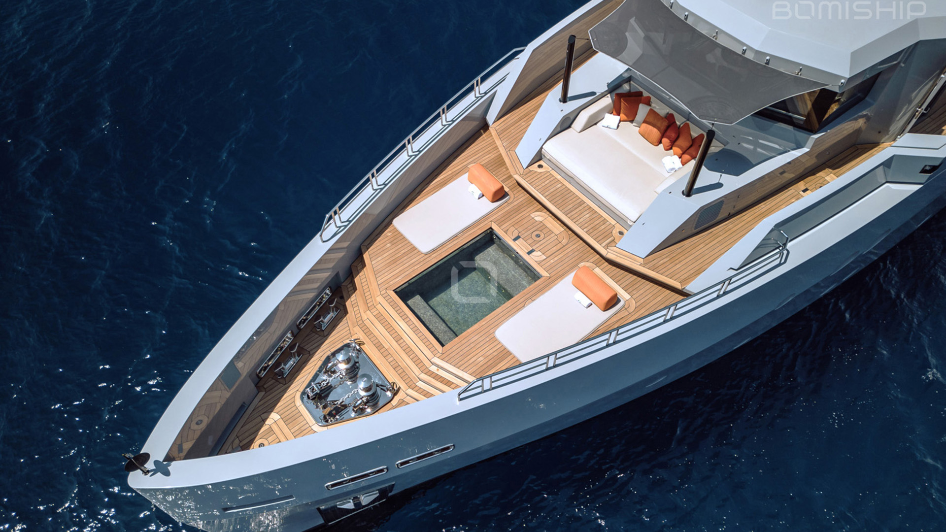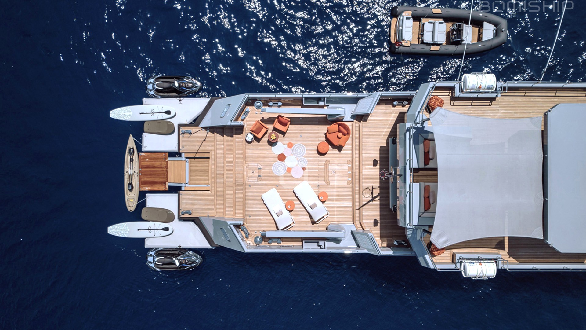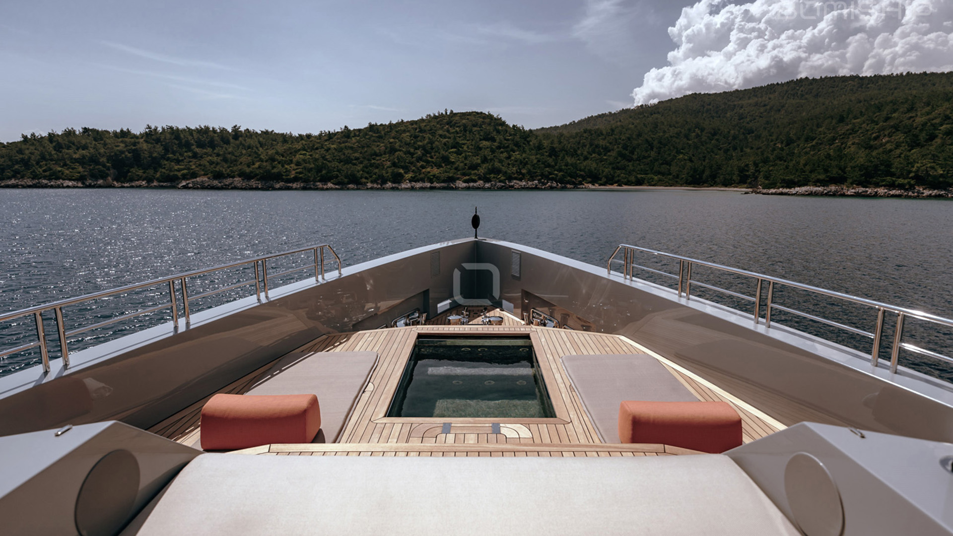 The aft deck opens into a dynamic beach club perfect for sunbathing, socializing, or setting off on a day of watersports. With a transformer platform built into the stern, boarding tenders, diving into the sea, or launching a jet ski is effortlessly elegant. At the bow, the hidden pool/jacuzzi, clad in Bisazza tiles, offers both functionality and minimalist design easily concealed under a teak deck when not in use, thereby expanding the outdoor lounging space.