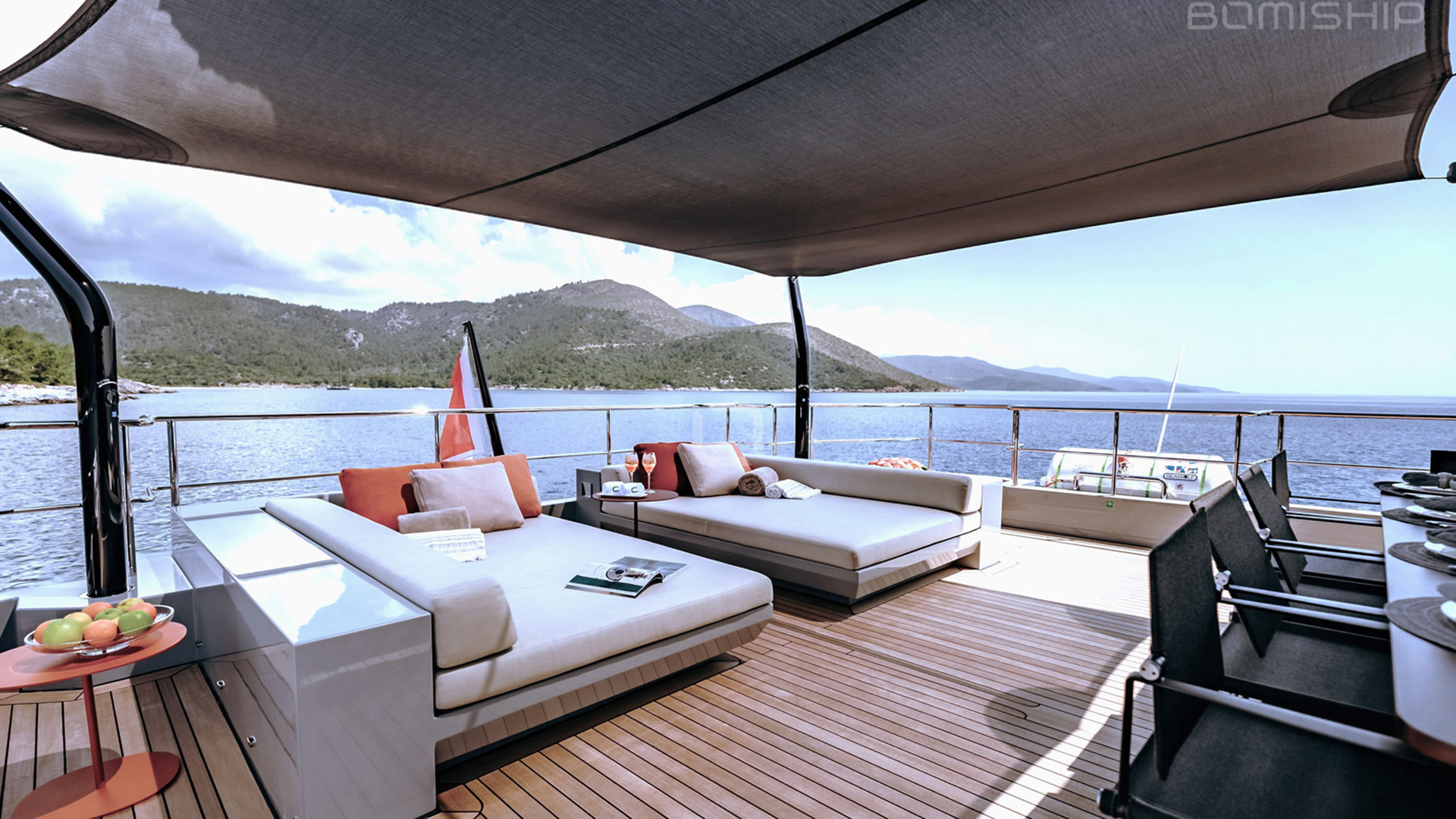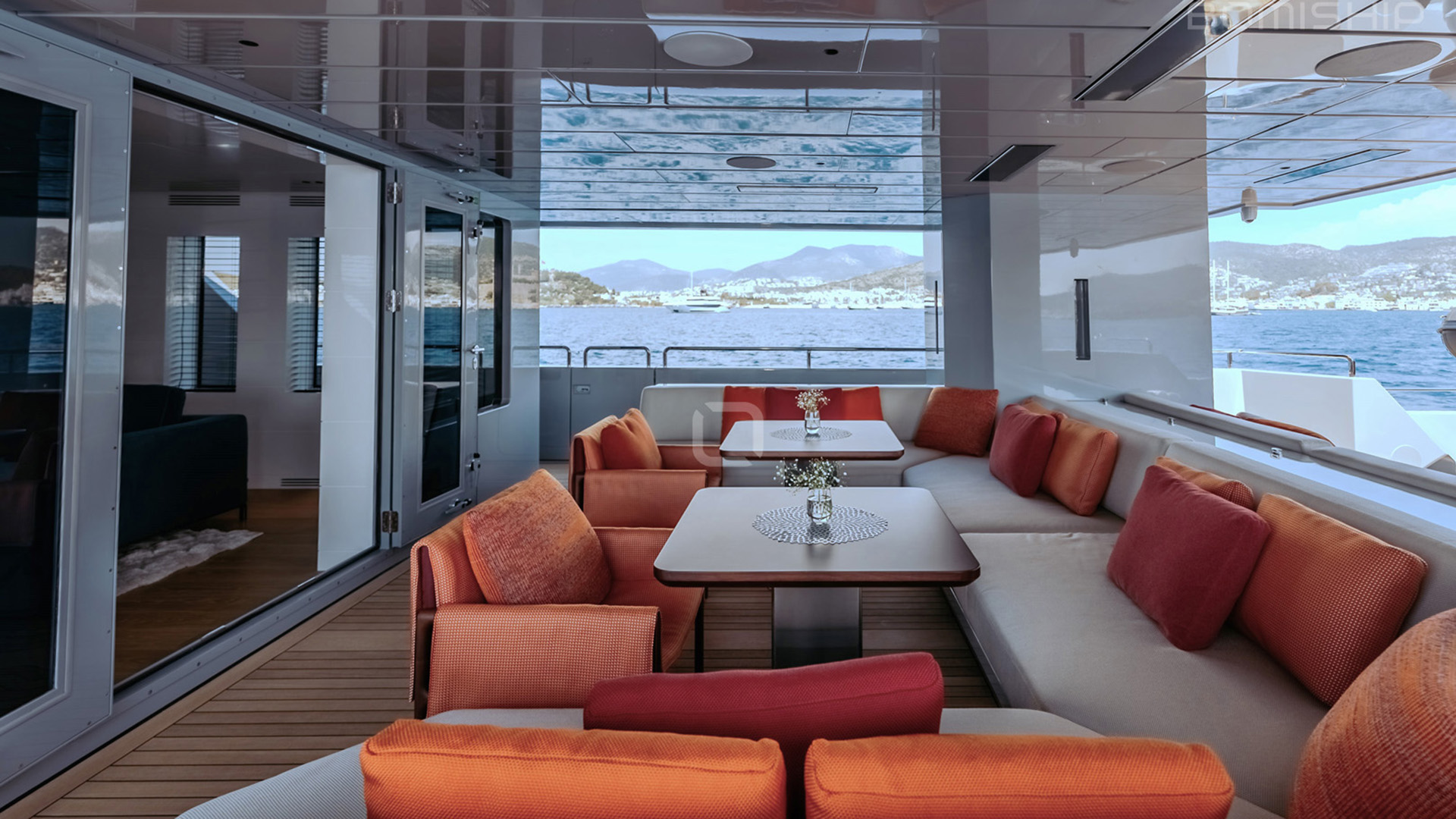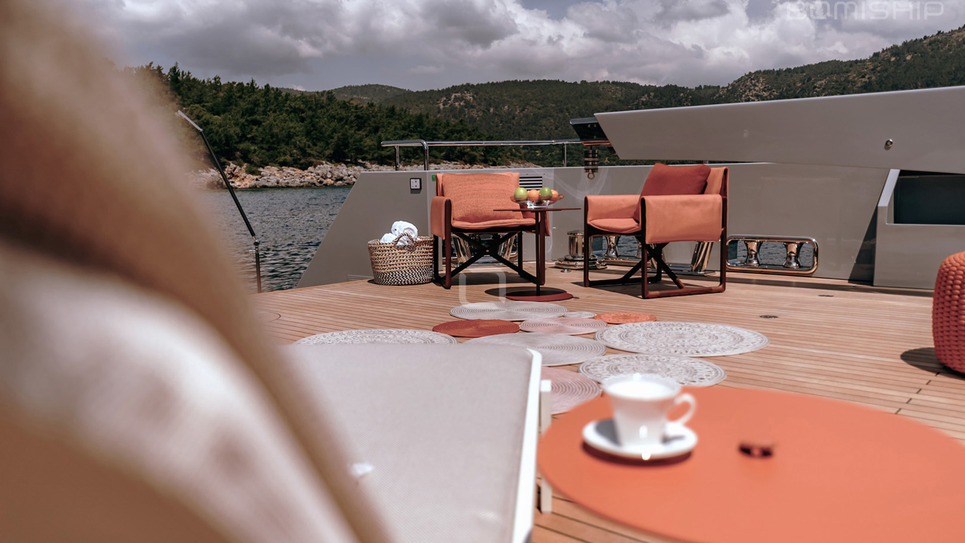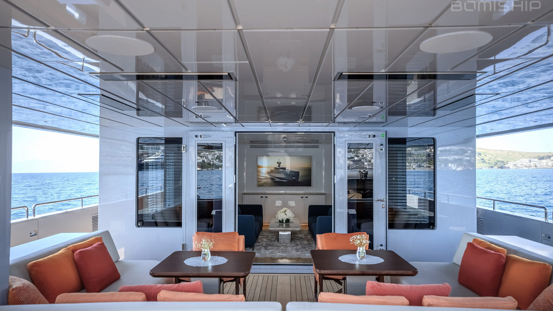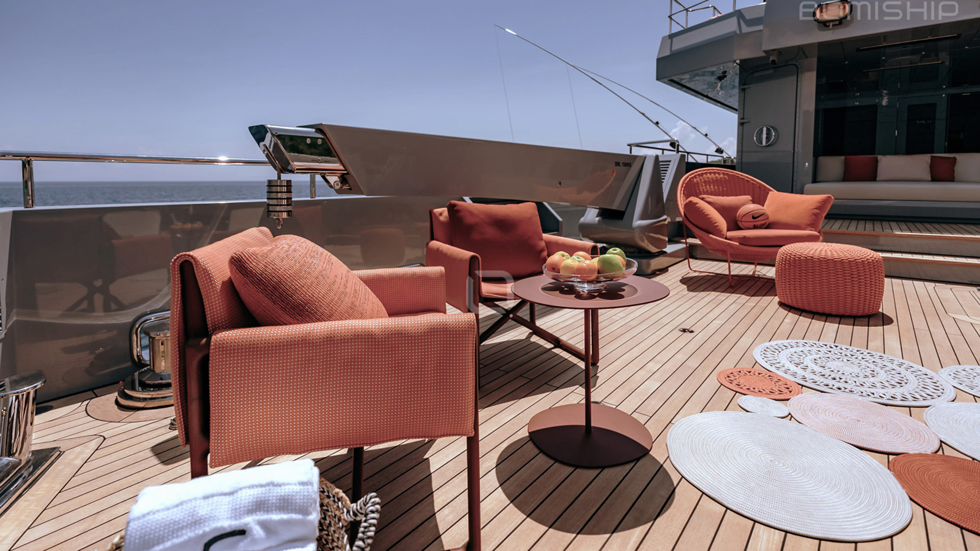 The aft deck opens into a dynamic beach club perfect for sunbathing, socializing, or setting off on a day of watersports. With a transformer platform built into the stern, boarding tenders, diving into the sea, or launching a jet ski is effortlessly elegant. At the bow, the hidden pool/jacuzzi, clad in Bisazza tiles, offers both functionality and minimalist design easily concealed under a teak deck when not in use, thereby expanding the outdoor lounging space.