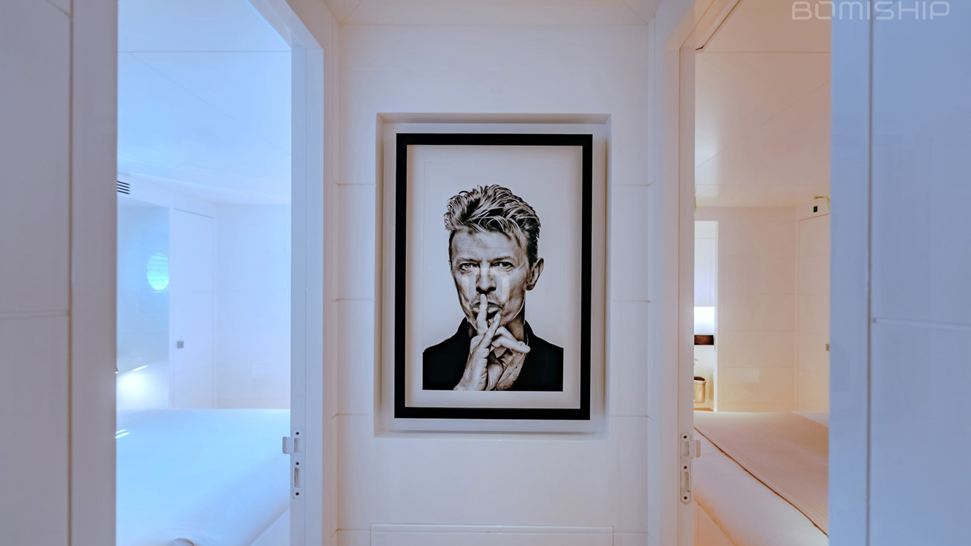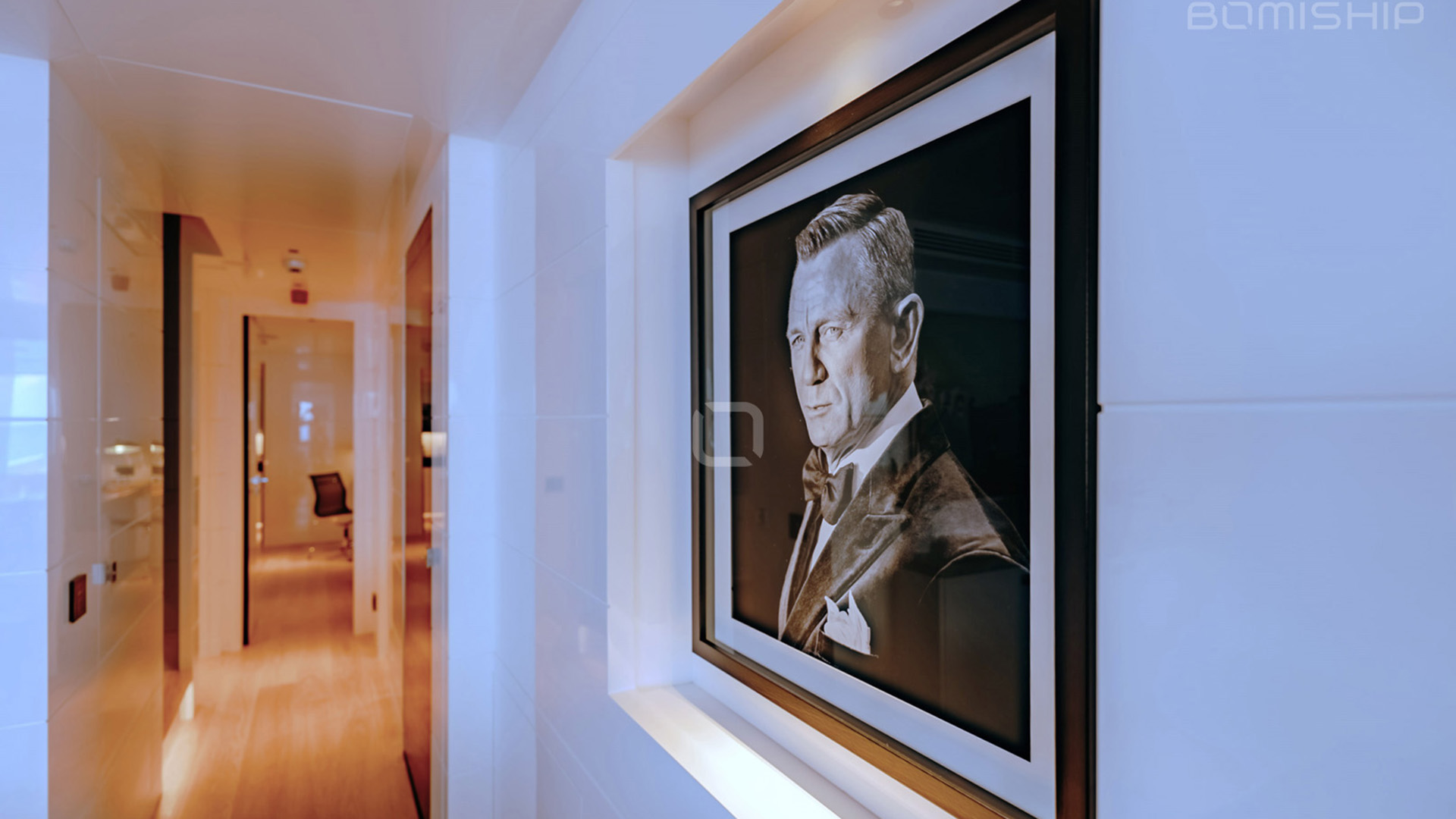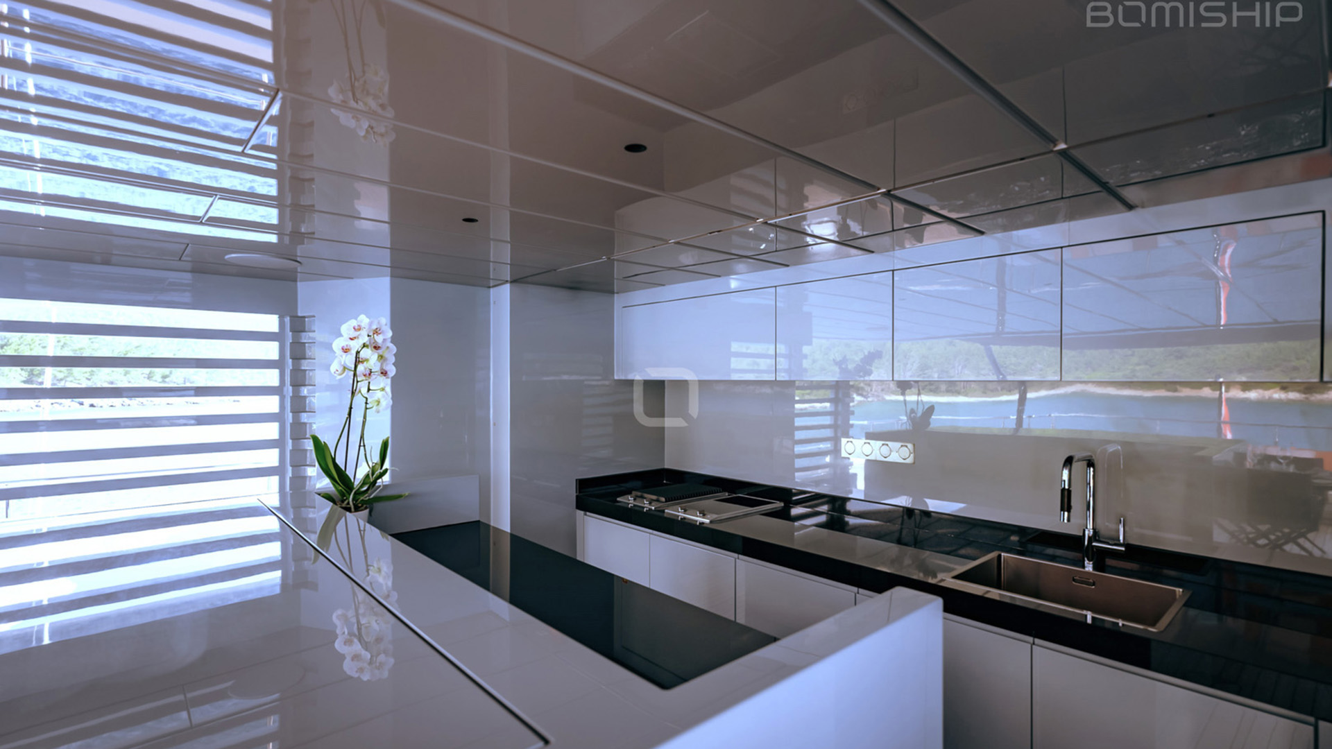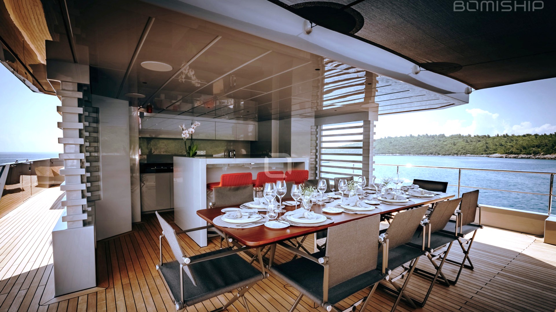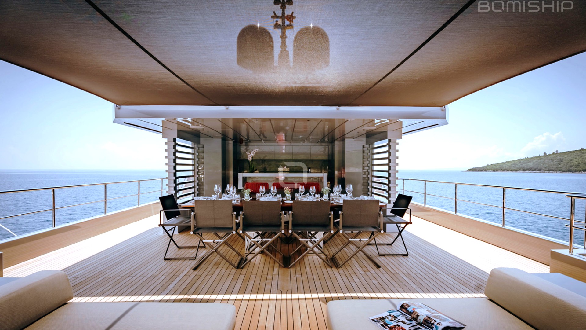 The aft deck opens into a dynamic beach club perfect for sunbathing, socializing, or setting off on a day of watersports. With a transformer platform built into the stern, boarding tenders, diving into the sea, or launching a jet ski is effortlessly elegant. At the bow, the hidden pool/jacuzzi, clad in Bisazza tiles, offers both functionality and minimalist design easily concealed under a teak deck when not in use, thereby expanding the outdoor lounging space.