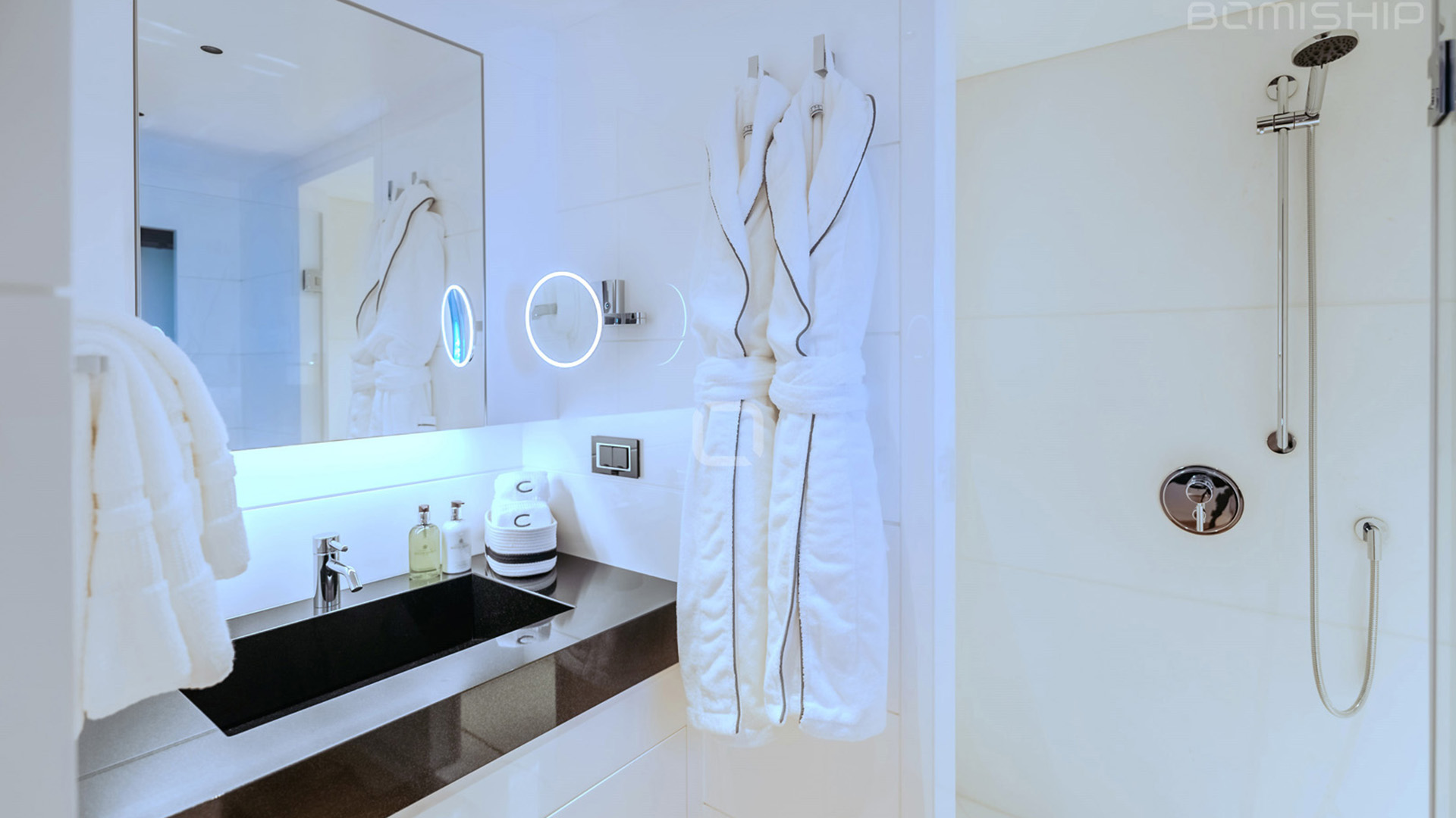 Full-beam Master Suite on the main deck, complete with a king-size bed and an ensuite bathroom boasting twin sinks and a rain shower. The lower deck features two double and two twin cabins, all en-suite, ensuring equal comfort.