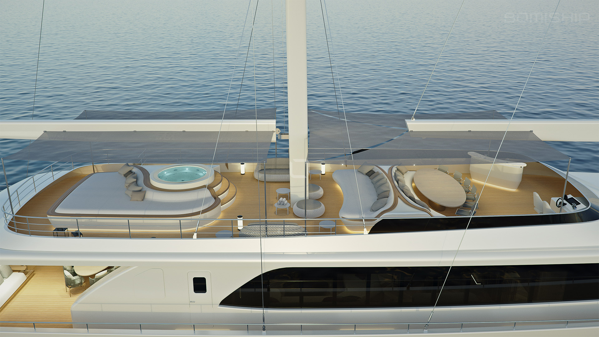 Beach club with Finnish sauna, gym, large bathing platform 20 sqm, teak decks, Kohler generators 2 x 85 kW and Kohler generator 1 x 50 kW, Aircondition, Watermaker Duplex 2 x 300L/h, Sun awnings on all decks, a large sunbathing platform with shower 20sqm, Jacuzzi for six pax, Icemakers x3, Wine coolers in saloon.r Wet bars, Ambient lights, Underwater lights, Outdoor projector for movie night under the stars, sun lounge areas.