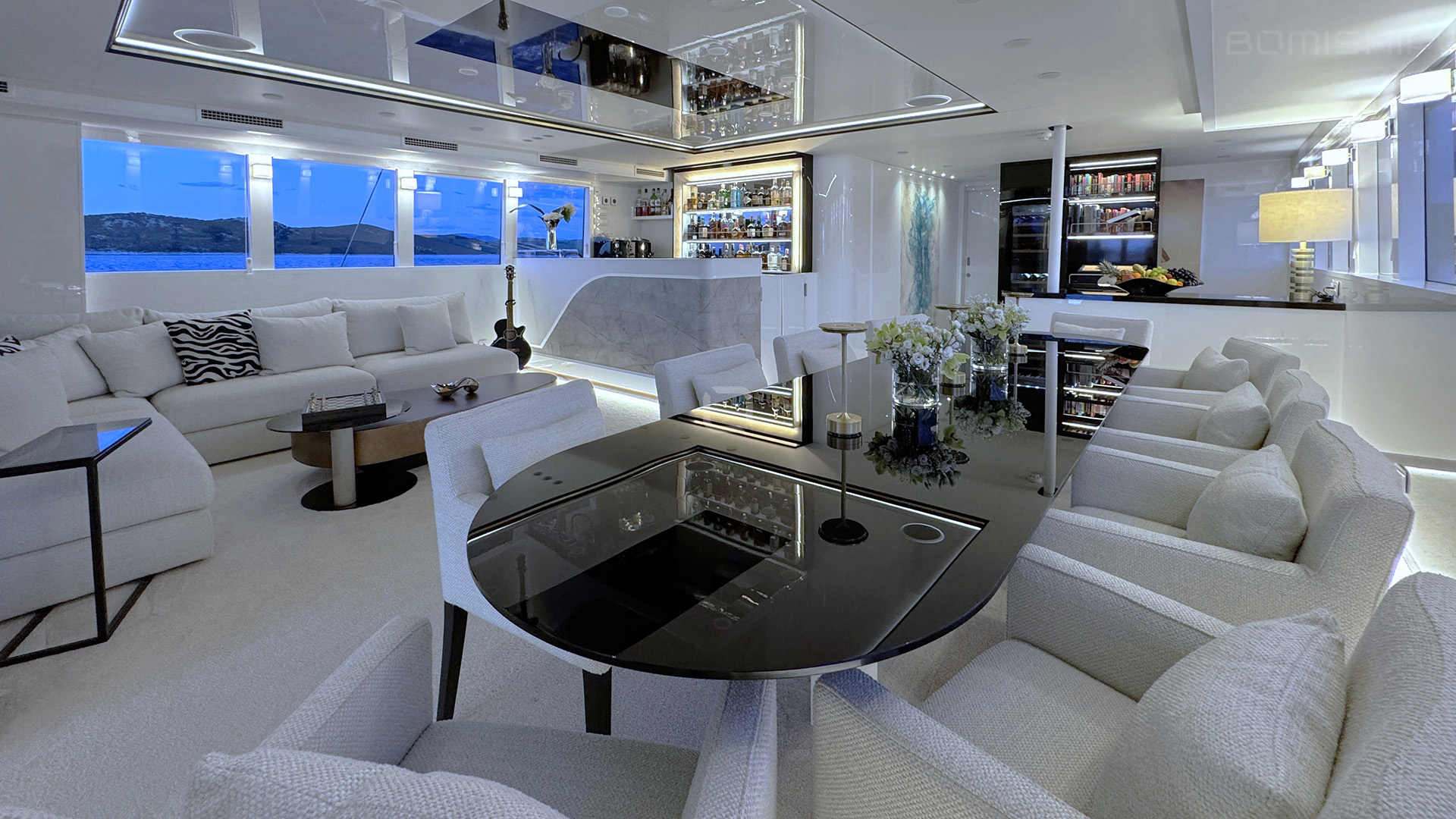 The elegant lounge extends to the stern dining area with a table for twelve, totaling nearly 100 m2. The flybridge, which is 120 m2, comprises a sunbathing area and a Jacuzzi to immerse you in relaxation and stunning vistas.